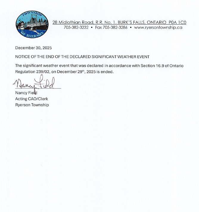 Effective immediately, the Township of Ryerson has declared a Significant Weather Event on all roads within the Township, in accordance with Section 16.9 of Ontario Regulation 239/02. This declaration will remain in effect until further notice.