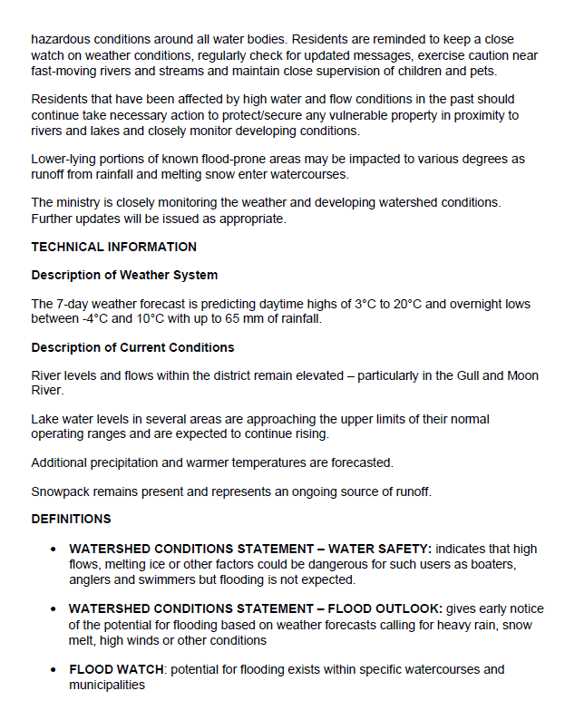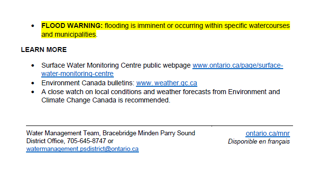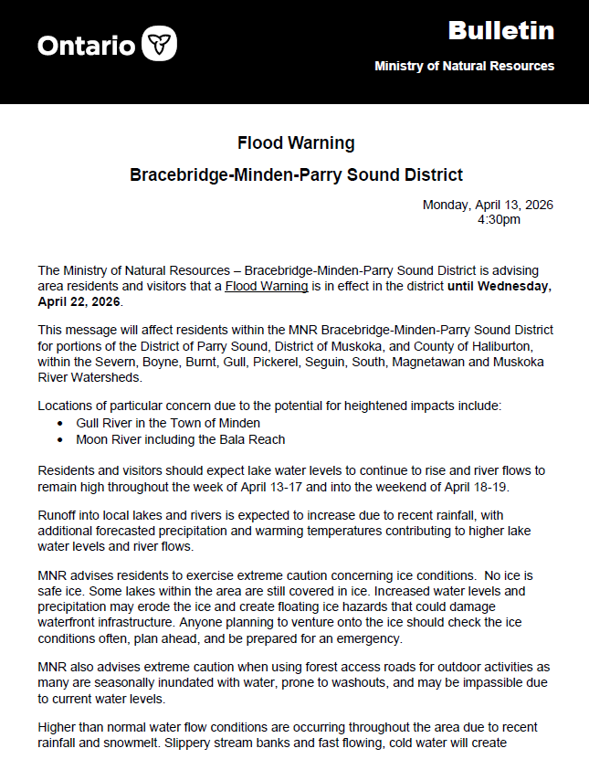 Flood Warning - MNR effect until Wednesday, April 22, 2026.